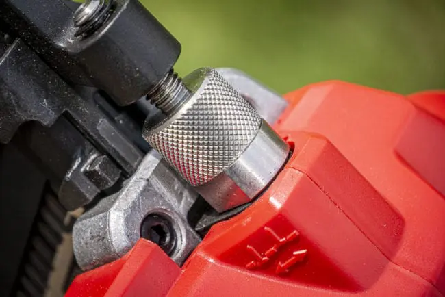 Positioned on top, the metal knurled knob is super-smooth compared to many of the other framing nailers we’ve used. It turns easily from one position to the next and works just as well with or without gloves.