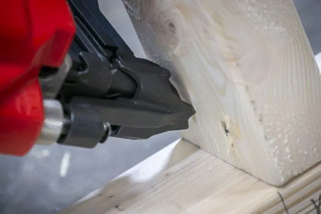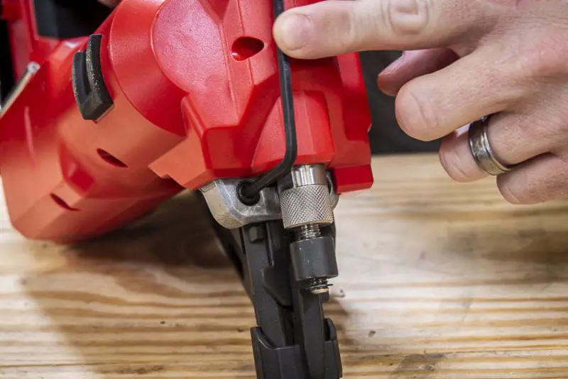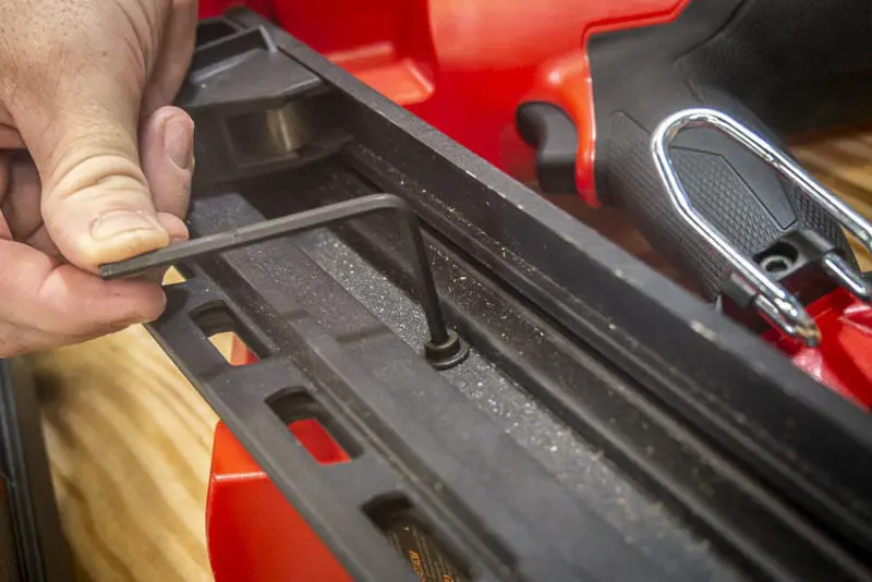 If you get a jam, there’s enough access to get a pair of needle-nose pliers around the offending nail. If you still can’t quite get it, the Allen wrench stores conveniently along the right side of the nailer to remove the magazine.