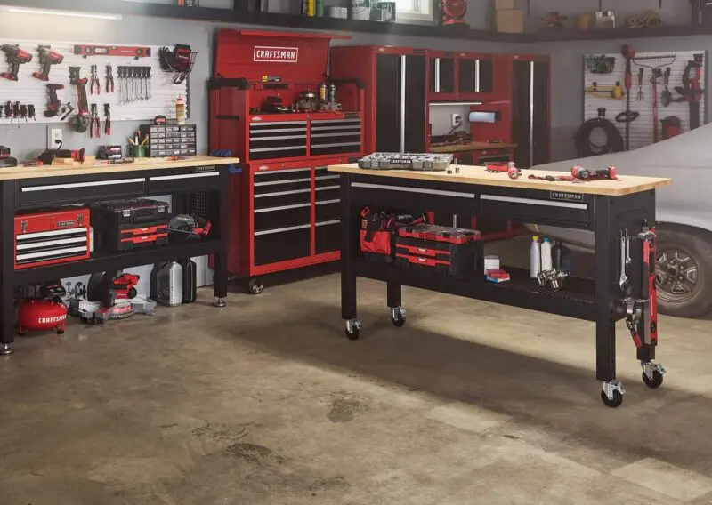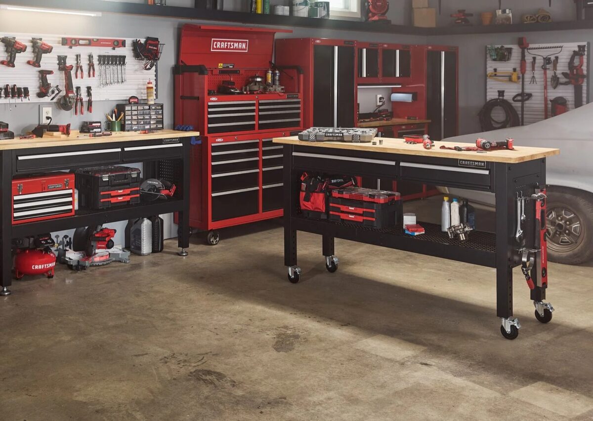 Craftsman has no shortage of tool chests and benches, but the 6-foot adjustable-height workbench stands out among the crowd. It features two soft-close drawers and a wire shelf underneath to store a variety of tools and accessories.