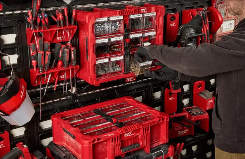 Milwaukee’s new Tilt Bin Organizer is one of the most recent additions to the Packout lineup. It features an impact-resistant base, letting you remove it from the wall and place it on the ground (or stack it on your Packout build) without worrying about damaging the enclosure. You can store a variety of bits, fasteners, and other small items in the 10 removeable quick access bins. For users who constantly juggle between accessories, this design brings an added level of convenience and security.