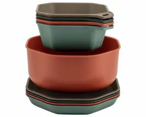 Why I Recommend It: If you like camping, the Gerber 16-piece ComplEAT Cook Set has everything you need. You get a stock pot and sauté pan with generous cooking surfaces and 3-ply base construction for even heat distribution. A stainless steel basting dome and slim lid are included as well. The tableware set includes four bowls and plates as well as a mixing bowl. These assist during prep work and are larger than most plate sets we’ve seen. Everything nests together neatly in an included storage bag to pack it in and out safely when camping and for storage between trips.